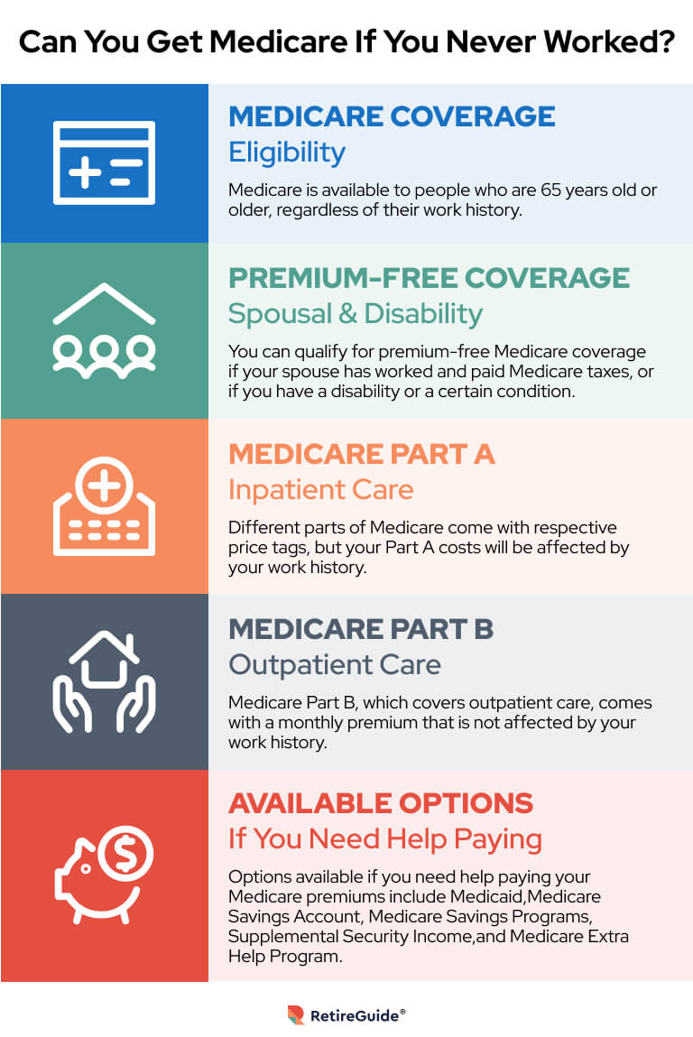 Medicare is available to people who are 65 years old or older, regardless of their work history. However, if you have not worked and paid Medicare taxes for at least 10 years, you may have to pay higher premiums for Part A and Part B. You can still qualify for premium-free Part A coverage in certain situations.
